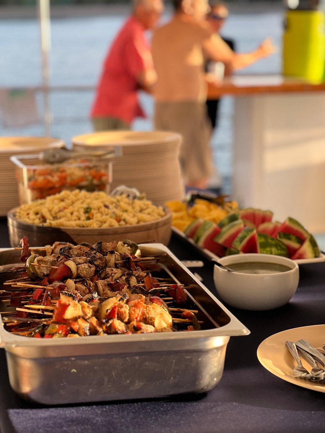 Delicious meal of grilled fresh fish brochettes served with pasta salad, mixed veggies, and fresh fruits.