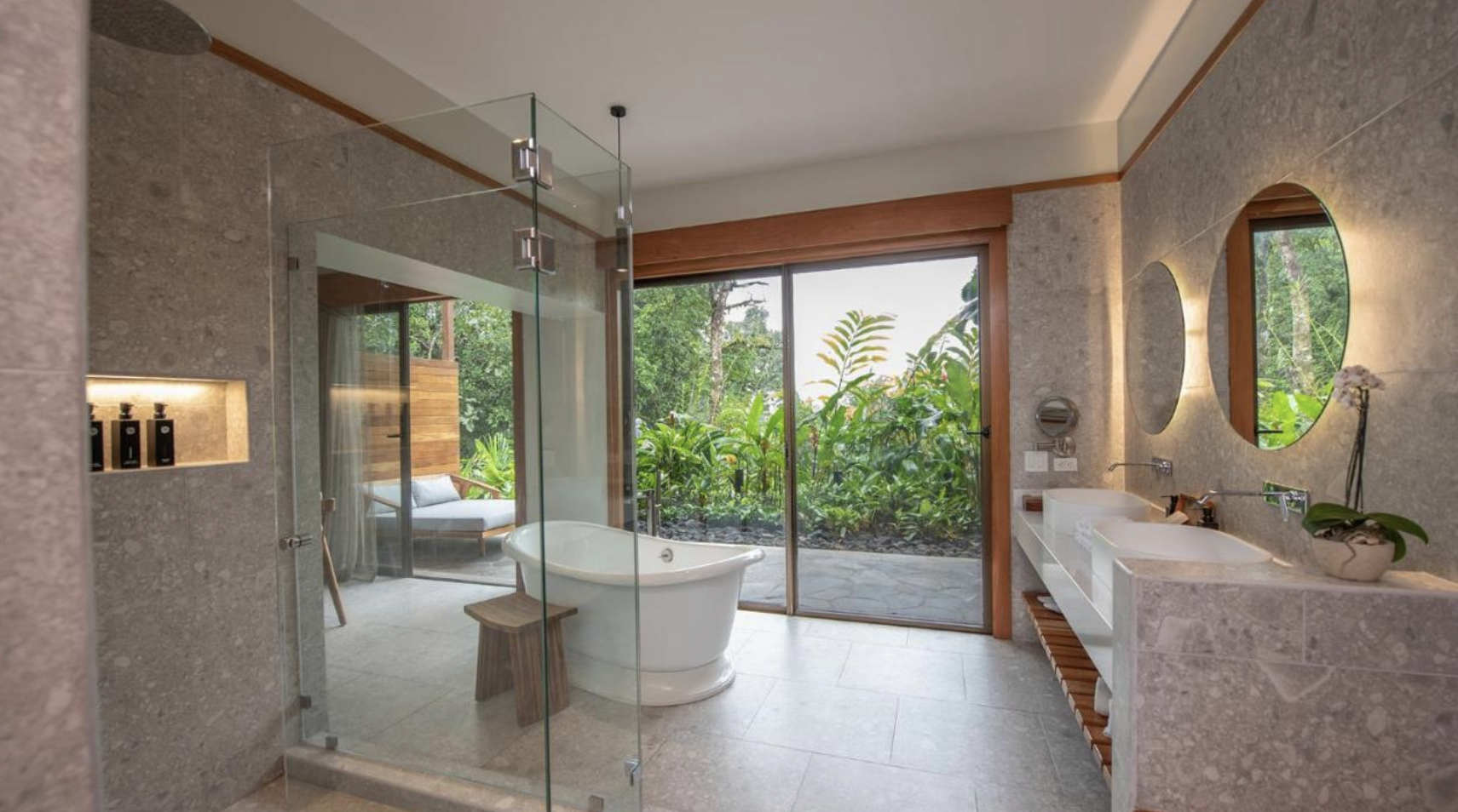 Our distinctive rainforest rooms seamlessly blend indoor luxury with an outdoor terrace overlooking the native tropical landscape. All rainforest rooms feature one king bed. The bathroom includes a bathtub and a separate, glass-enclosed shower.