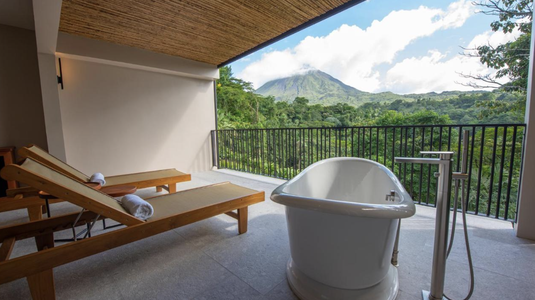 The Tabacon Suites are our largest single-room category, offering a spacious and modern setting with impressive views of the rainforest. Designed for relaxation and comfort, the suites include one king bed and a sofa bed. An extensive terrace (first floor) or balcony (second floor) and in-room jacuzzi with a separate glass-enclosed hot spring shower are part of the experience.