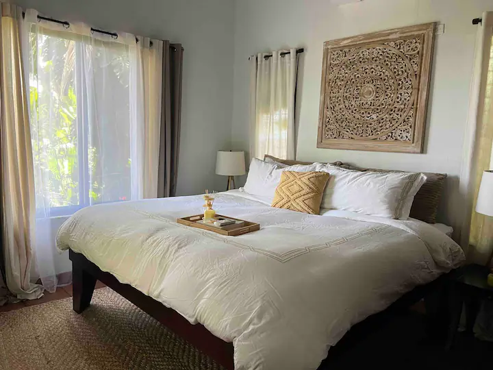 - A master bedroom with a private bathroom that opens on the left side of the pool. This 150-year-old king-sized bedroom was imported from Thailand and features a full-size shower with double sinks, large storage with safe, high ceiling, and a side window on the terrace.