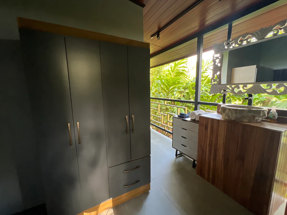 The main house is open-concept, with curtains available for privacy if needed. This unique accommodation allows you to fully experience the energy of Costa Rica’s nature. A 4X4 vehicle is required to reach the property; if not available, parking is possible on the ground below.